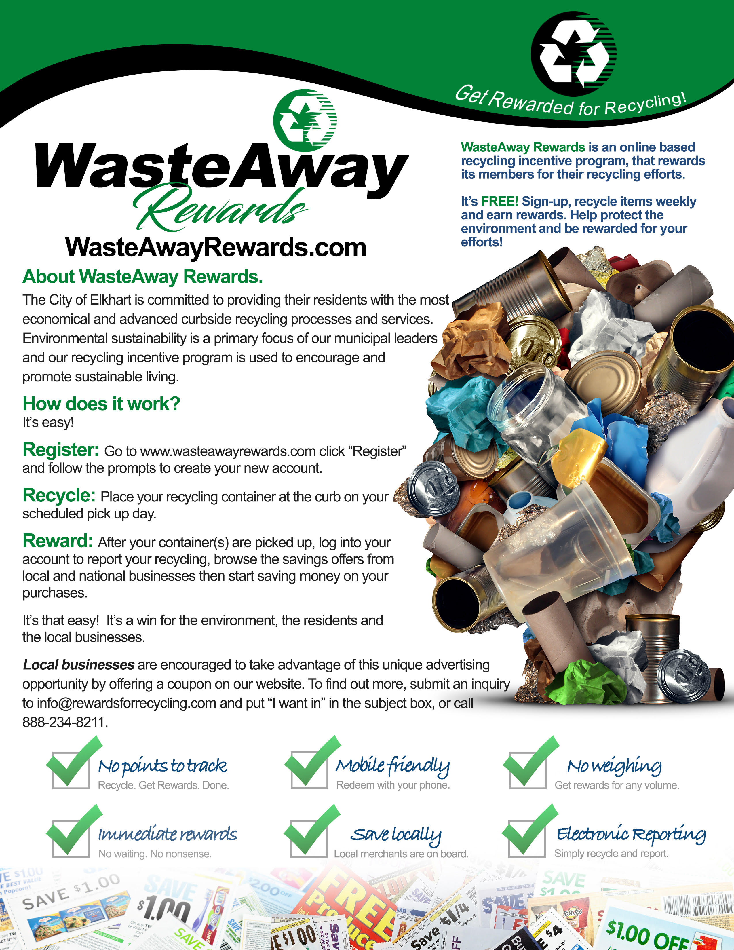 Welcome to Waste Away Recycling Rewards where it's easy being green! Waste Away has made it easy to recycle at home, and now get rewarded for doing so. Simply activate your free account, rinse and toss your recyclable materials into your recycling container, take it to the curb on your recycling day, report your efforts and SAVE at your favorite local places for doing so! No peeling labels, No sorting. Everything goes into one container. Join today-it will make Mother proud... Mother Earth that is!